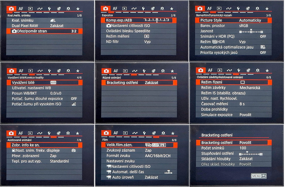 Čtvrtá skupina nabízí vyvážení bílé a další pomocníky k této funkci a pátá pak jen Bracketing ostření s pěti PÁTÁ hlavní skupina NASTAVENÍ: žlutě-okrová barvadalšími SVALNATÝ kompakt a OBŘÍ čip: Canon PowerShot-V1položkami po jejím otevření tlačítkem SET na zadní straně šasi (odhaluje devátý obrázek z leporela zde nad odstavcem). O položku zpět se mimo zmáčknutí MENU dá vracet symbolem „zákaz otáčení“, pokud jej displej nabízí. Červený symbol Fotoaparátu mám celkem OSM podnabídek a bohatýrské možnosti nastavení pokračují RŮŽOVOU SKUPINOU AF - zde jsou 3 podnabídky k funkcím automatického či manuálního ostření Fotoaparátu...