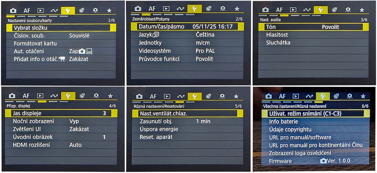 MODROU SADOU (symbol PLAY a 4 podnabídky) pokračují povely k ochraně snímků či mazání, pro formát RAW a Zelená hvězdička vpravo je poslední položkou v MENUfiltry, k prezentaci; a pak Přizp. displej, kde stojí určitě za zmínku Indik. přesvětl., což je dle všeho indikace přepalů čili Zebra. FIALOVÉ TRIO obsahuje bezdrátová spojení s chytrými zařízeními nebo k dálkovým ovládáním, má celkem 3 skupinky, z nichž možná málokdo u nás v ČR využije "Načtení dat pro kontinentální Čínu" a ve 3. kartě se dá "Vymazat nastavení komunikace". OKROVĚ-ŽLUTÉ zbarvení má montážní klíč s obecnými volbami (čas, jazyk, jednotky, tón, hlasitost, jas atd.), když v páté skupině je Nastavení ventilátoru chlazení, "Zasunutí objektivu" či úspora energie (dodatečné foto je poznat)...