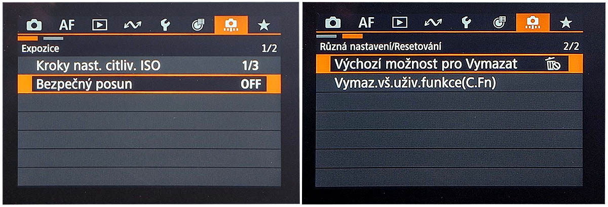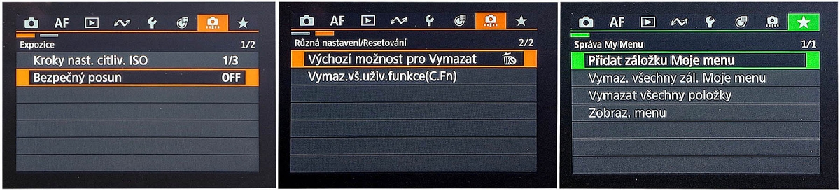 Druhá z hlavních nabídek v MENU Cnnon PS-V1: AF atd.