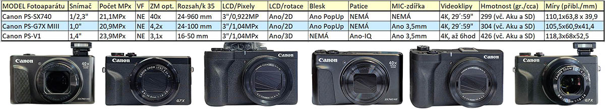 Za úvodem prolétnu příbuznými tématy; a předtím zmíním DVĚ CESTY VÝBĚRU. Či spíše dvě skupiny vybírajících à Předchůdce G7X MII v elegantním a dostupném pouzdrula „Křeslo MPV a interiér v kůži“ versus „Displej a Akcelerace“. Je mi sice jasné, že 100 čtenářů má STO názorů a pocitů, ale nějak tak vidím rozhodování, Jestli chci raději menší snímač a parádní ZOOM; nebo větší čip a chudší transfokátor. Druhdy se představily 1.0-čipové VLOG-kamery firmy Sony ZV-1 a ZV-E10. Canon tu měl bílou 250tku, 4káčkový Triedr SX70 a dva Ultra-zoomy k pomazlení; a předchozí G7X MII plus pouzdro. Přibyl dalekonosný LUMIX FZ82 a čerstvě také nedostatkový ultra-ZOOM Canon PS-SX740, s nímž zde bude dnes porovnávací Casting s PS-V1…