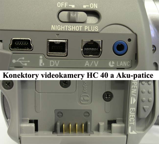 Detaily přípojných zdířek a AKU (Klikni pro zvětšení)Hned za úvodem připomeňme něco o zmiňovaných nahrávacích systémech. Sony je dnes jediným producentem na světě, jenž dává na trh (dokonce) 6 nahrávacích systémů! Bereme-li to podle záznamových (ukládacích) médií, máme tu úctyhodný výčet možností: zatímco starý dobrý analogový Hi8 (1.) je sice už labutí písní značky a nakonec už i celosvětově asi končí, digitálních druhů záznamu máme u tohoto výrobce hned pět (5!). Digital8 (2.) se svou druhdy zajímavou variantou přechodu z analogů na digitální média je omezen po všech stránkách už dnes velice okatě, ale rozšířené modely Mini DV (3.) s páskou 1/4“ představují velmi solidní záběr, jemuž se může sortimentně rovnat v současné době snad pouze Canon (viz i dále). Varianta malého DVD-disku 8cm (4.) tu zatím také není příliš k posuzování historické úspěšnosti - a naopak uzoučká páska MICRO-MV (5.) bohužel vypadá jako poněkud tragický omyl. Zbývá doplnit experiment, jenž je u nás znám asi nejméně - nahrávání komprimovaného videa až do kvality MPEG2 na někdejší objevný patent firmy Sony: malý MD-disk (6.) - psali jsme zde i o něm…