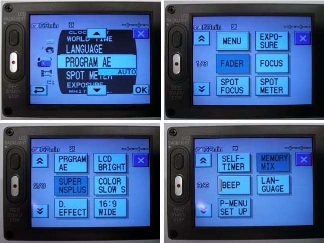 Menu-nabídky na dotykovém LCD (Klikni pro zvětšení)Ošklivost! To byl první dojem, na kterém jsme se ve firmě shodli všichni. Ne proto (fakt!), že bychom měli z jiných firem mít nějaké prémie, ale prostě proto, že uspořádání těl a objektivů kamer je takové… - …no neatraktivní… Veliký kladem sice je, že nové modely se dají držet a ovládat i nezaučeným laikem, ale dotykový LCD-panel bez možnosti jiné volby (proč asi tuto dvojí volbu - tedy i klasickým ovládáním - má dosti vyšší typ DCR-TRV940?) a jiných specialit řady si mohli milí Japonci odpustit: už jen (opět!) nové uspořádání kontaktů maličkých napájecích akumulátorů NP-FP znamená nekompatibilitu s předchozími modely. A nevýklopný - pouze výsuvný - hledáček zase znepříjemní variabilnost pohledů do této hlavní pomůcky většiny kameramanů, kteří už alespoň trochu "znají mapu". Natáčení záběrů pomocí vyklopeného LCD-panelu je (v celé Evropě) dost v módě, ale já se držím staré zásady - natáčet nejlépe pomocí hledáčku: jsme více v ději, neruší nás okolí ani slunce a v neposlední řadě kamera spotřebovává méně energie (udává se běžně až o 30%). Pravda - estetika nám vadila poněkud více u "hrbatého" typu HC40, než u nahoře nižších kolegyň, kde to je zřetelně vidět např. na obrázku dvou kamer spolu: DCR-HC40 vedle HC20…