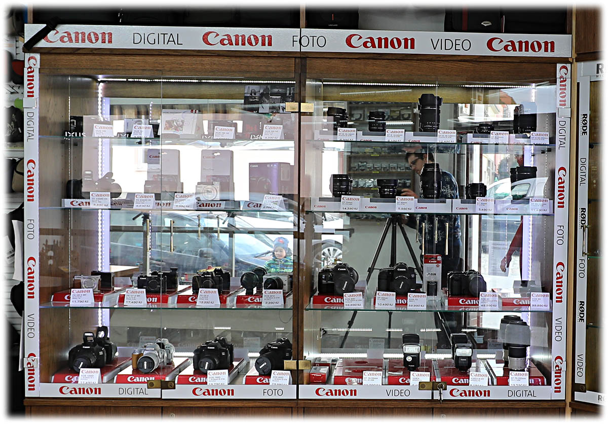 Vedle AUTO- a AUTDŮROVEK je hlavní vitrínka Panasonic. Tady jsme loni na podzim po mnoha sezónách váhání konečně doplnili vcelku slušný záběr fotoaparátů této velmi zajímavé značky. Máme tu tedy dvě patra foto-přístrojů, jednu polici amatérských videokamer včetně té nejvyšší hledáčkovky HC-VXF990 a dolní polici s profesionální mašinou HC-X1 i doplňky. Další rozbor této skříňky nebude unavovat čtenářovu pozornost - přejdeme plynule na Canon. V jeho KAMEROVÉ vitríně jsou (shora) amatérské modely LEGRIA HF R806 (černá i bílá varianta) a nejvyšší z řady HF R88. V ostatních patrech pod nimi jsou poloprofesionální mašinky HF G40, XA11, XA30 a GX10 - a své místo tu mají bez ohledu na aktuální foto také profesionální modely, jako (dosavadní) XF200 nebo (nastupující) XF400. Canon má ostatně u nás i dvě vitrínky s kompakty a zrcadlovkami (+ "bezzrcadla") včetně doplňků, což jaksi dokládá naši náklonnost pro tuto velmi profitní značku…