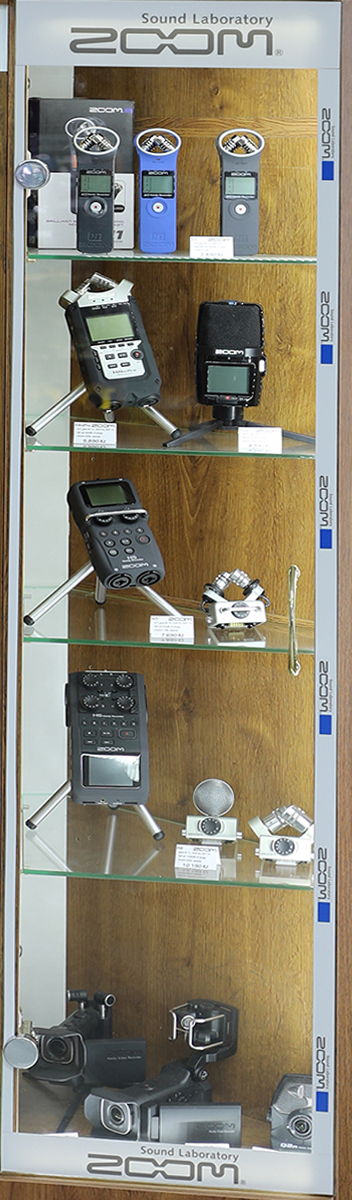 Vitrínka na míru pro audio-rekordéry firmy ZOOMZOOM. Opět audio-doplňky z kategorie pro fajnšmekry. Zvuková „nahrávátka“ nejrůznějších tvarů i funkcí začínají nejjednoduššími „diktafony“ ZOOM H1, které máme dokonce na výběr ve třech barevných provedeních. Následuje vyspělejší H2n, velmi dobře známá verze H4n už i s tzv. XLR-zdířkami a na poličkách pod nimi pak libůstky, které ocení hlavně poučení laikové a profesionálové. Je tu mimochodem ZOOM H5, velkorysejší H6 a experimentálně vyhlížející Q2n (tvarově připomíná foto-past), jakási minikamerka Q4n a zajímavým nástavcem opatřená obdoba Q8, přičemž všechna „Kvéčka“ mají barevný displej, kromě Q2n výklopný na způsob standardních LCD u videokamer. K této kategorii zbývá doplnit vcelku rozsáhlé příslušenství, které mám vystaveno hned vedle výlohy (tu zmíníme dále též). Firma ZOOM dodává tedy ke svým audio-rekordérům různé sady doplňků a taky třeba kožešinky proti větru…
