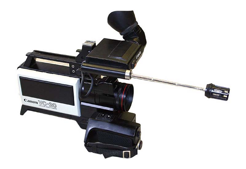 Přestože videokamer s oddělenou snímací a záznamovou částí (videorekordérem přes rameno) byla celá řada, přehoupněme se přes ně jedním z (pro nás) nejjednodušeji dostupných modelů, tedy co se fyzické hmatatelnosti týká. Canon VC-20 coby velký tzv. ramenní přístroj (208x218x331 mm a 2.5kg) je osazen snímačem SATICON, čB-hledáčkem, na tehdejší dobu vcelku dost výkonným objektivem s 8násobným přiblížením a zvláštním teleskopickým mikrofonem; a jak bylo v těch dobách celkem často zvykem, mnohé součásti se daly rozpojit nebo připojit jako stavebnice. Držení zápěstním řemínkem vpravo před objektivem obsahuje i ovládání transfokátoru, podobně jak to má uspořádáno další vyobrazený typ VM-E1. Tento první Canovision8, coby jakýsi napůl ramenní stroj s demontovatelným madlem k přenášení už má - přes své míry (143x149x333 mm a 1.980g) - evidentně velmi podobné tvary s běžnějšími videokamerami a i výbava by mohla být dnešním fandům oboru srozumitelnější. Půlpalcový snímač, automatické i ruční řízení ostření a ZOOM-u (6x), manuální řízení clony, zatmívačka (FADE) nebo LP-režim a další vymoženosti tohoto BIG-stroje budiž důkazy předchozího tvrzení…
