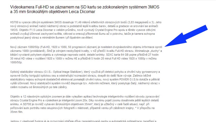 Panasonic HDC-SD700 v detailu zepředu (Kliknutí zvětší)Videokamera Panasonic HDC-SD700 má kompaktní mini tělo s rozměry 66x69x138 mm a hmotností 380 gramů. Za objektivem s logem LEICA DICOMAR, disponujícím 12násobkem optického a 18násobkem inteligentního přiblížení, je osazena trojice 3MOS-snímačů s celkem 3,05MPx a úhlopříčkou 1/4,1“ u každého. Celkový součet obrazových bodů (pixel) na čipech představuje úctyhodné číslo 9,15MPx, s údajem o 6,96MPx efektivních na českém webu a 7,59MPx na německých stránkách výrobce. O momentálních (ne)funkcích či absenci základních dat právě na těch českých nebudu plýtvat textem, snad jen pobavím fandy oboru printscreenem jejich studeného patky na příslušenství. Dnes se nebudu mimochodem rozepisovat zdlouhavě popisem celého stroje, ale zaměřím se spíš na praktické poznatky. Polemizování s oficiálními údaji webu čs. zastoupení by asi nic nezmohlo a vysmíváním bych si stejně neudělal dost radosti - tak ještě tři příklady: progresivní záznam 50p má být prý nositelem dvojnásobných informací (klik) - při nejnižším datovém toku z potenciální trojice konkurentů. Jinde nás utvrzují, že co SD700 nahraje, to (dokonce!) i přehraje (klik), ale exces No1 je tvrzení o 5tivšemocném stabilizátoru (klik), raději běžme dál…