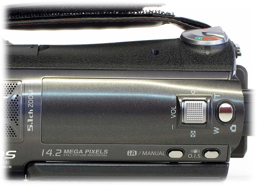 Panasonic HDC-SD700: detail přípojek (Kliknutí zvětší)Dotykový displej k ovládání většiny všech manuálů je dnes už natolik profláknutý, že o jeho (ne)vhodnosti na kamerách raději ani nezačnu polemiku. Manuálů má tato kráska vyvedeno na tělo tak málo, jak to mívá i současná konkurence v této cenové a výkonnostní kategorii. Na dolním okraji rámečku výklopného LCD jsou vstupy do MENU, druhé ovládání transfokátoru (myslím-li tím prvním horní pro pravý ukazovák nebo prostředník), druhá video-spouš (tou první opět myslím stříbrný oválek pro pravý palec) a symbol k odstranění dat (koš). Na levé straně nad okrajem (zavřeného) displeje je dvojice tlačítek iA/MANUAL (volba manuálů nebo režimu z tzv. inteligentních programů) a O.I.S. (stabilizátor). Inventuru tlačítek uzavřeme obdélníčkem CAMERA FUNCTION vpředu na válci objektivu (obdoba volby ručního řízení zmíněného iA), foto-spouští za horním transfokátorem a netlačítkovým prvkem důležitého multifunkčního prstence řízení manuálů coby rýhované obruby objektivu. K předchozí kritice stránek českého centra Panasonic si přidám několik dílčích zděšení z veřejně dostupného návodu pro SD700, kde se dezorientacemi a dezinformacemi fakt nešetří (měli by tvořit střízlivější :-D)…