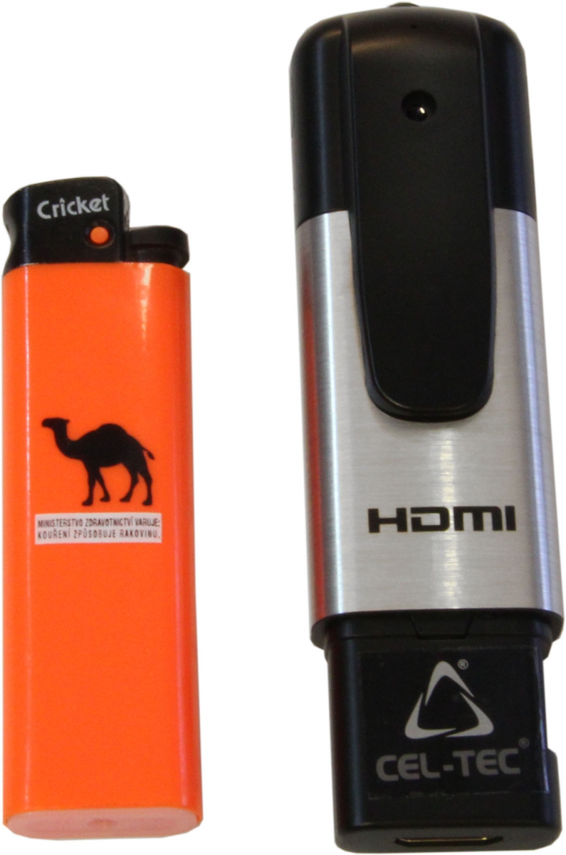 Indikační diodyCel-tec S300 slot pro paměťovou kartuCelt-tec S3000S3000 na první pohled působí jako lákařská pomůcka do kapsičky pláště na hrudníku nebo podobné udělátko; a díky svému tvaru, rozměrům 108 mm x 27 mm x 18 mm a hmotnosti 38g, je možné přístroj nosit například v kapsičce na košili. Videozáznam je ukládán ve formátu MOV s kompresí H.264 ve FULL-HD při 30 snímcích za vteřinu na paměťovou kartu micro-SDHC. Spuštění záznamu se provádí stiskem tlačítka "REC", které se nachází na zadní straně, stejně jako LED kontrolka pro signalizaci probíhajícího záznamu. Maximální délka pořizovaného záznamu na jedno nabití akumulátoru je cca 60 minut a doba nabíjení článku pak přibližně 120 minut. Díky mini-HDMI konektoru můžeme kameru připojit k jakékoli moderní TV a sledovat pořízené videozáznamy. Nabíjení se provádí konektorem mini-USB, součástí balení je HDMI-kabel, USB kabel pro spojení s PC a návod v češtině. Vše za cenu 2490 Kč.