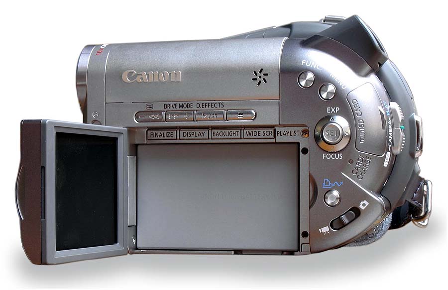 Nižší DC10 je vybavena snímacím CCD-čipem úhlopříčky 1/4" a 1,330.000 obrazovými body (efektivních Px je pak 1,233.000 pro foto a 860.000 pro video), zatímco vybavenější DC20 má CCD-čip 1/3,9" s 2.200.000 body (efektivních 2.000.000 pro foto a 1.770.000 pro video). Obě kamery jsou vybaveny objektivy Canon s desetinásobným optickým přiblížením a světelností f/1,8. Ohnisková vzdálenost je pro DC10 46,7-467 mm a pro DC20 o facku širokoúhlejších 40,6-406 mm (tyto hodnoty jsou přepočteny na ekvivalent kinofilmu). Barevný hledáček (113.000 bodů) a 2,5" výklopný displej (123.000 bodů) je u obou výrobků stejný. Hledáček je zde bohužel nevýsuvný a nevýklopný - jak je v současné době módní - naštěstí je výrazně natočen směrem nahoru, což natáčení usnadní. Statické snímky se ukládají na paměovou kartu typu mini-SD, což je zatím nepříliš rozšířený formát, známý spíše majitelům některých mobilů. Zcela nový typ AKU je umístěn pod výklopným displejem - což prakticky znemožňuje použití větší kapacity - a je označen BP-208. Krytka objektivu je vestavěná - otevření a zavření se provádí mechanickou páčkou - a konektory jsou standardní. K informacím přikládáme několik vyobrazení (klikněte na odkazy)…