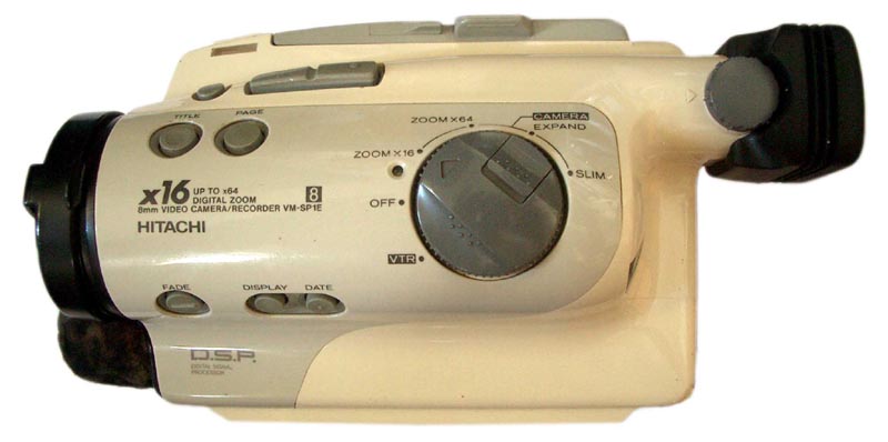 A máme tu HITACHI, tentokrát analogový VM-SP1E: byl jedním z modelů firmy, jimiž se snažila vcelku úspěšně oslovit sportující veřejnost. Kvůli odolnosti vůči vodě, dešti, prachu či písku (a logicky například i při raftingu a podobných sebevražedných sportech) byly poměrně dobře prodejné tzv. "dvoj-pouzdrové" videokamery této značky. Popisovaný a vyobrazený model byl nabízen katalogově v roce 1993 a měl možnost volby červeno-bílého nebo šedě-bílého (vyobrazen) pouzdra. Vodotěsnost zajišoval zmíněný "dvoj-obal" pomocí gumových těsnění, která bylo nutno občas přetřít přiloženou silikonovou vazelínou. Vlastní stroj byl tedy uvnitř tohoto obalu. Jak je patrno z obrázků, pojistkami jištěné víko skrývá vcelku normální kameru, která je - jako mnoho dalších od Hitachi - napájena akumulátorem v předem daném šuplíčku, což znemožňovalo (tehdy) uživateli přikoupení vícenásobné kapacity. Uspokojivé řešení přinesly až cca před 3 roky Ni-MH akumulátory firmy GP, které mají dnes již 2.100mAh proti původním 1.200mAh Ni-Cd (při stejných rozměrech!). Vlastní ovládání je nakonec úplně běžné a jediným hmatatelným rozdílem je pro uživatele mačkání na gumová tlačítka.