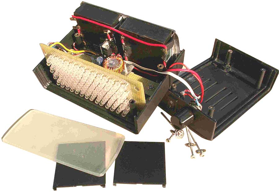 Vlastní realizace světla už vyžadovala "pouze" kutilskou zručnost. Pan Zdeněk našel na Internetu strojně předvrtanou desku z tzv. Cuprextitu s roztečí děr 2,5mm. Věděl, že v případě samovýroby tohoto dílu včetně vrtání bude dodržení přesnosti náročnější a výsledný efekt uspořádání LED-diod nemusí být úhledný. Osadil 56 dvojic diod a zapájel je ve zmíněném sérioparalelním zapojení. Výše naznačovaný tip na krabičku s jakoby ventilačními otvory KP 08V se ukázal být tou volbou z kategorie Bingo (jak by napsal Eda :-D), protože mřížky zajišují přirozený přísun chladícího vzduchu. Přední díl krabičky pak nahradil Zdeněk matným sklem pro zajištění dobrého rozptylu a k pořízení takového mlíčňáku stačila návštěva sklenářství, kde uřízli a obrousili požadovaný rozměr podle krabičky. Cuprextitová deska s diodami byla umístěna těsně za čelní sklo a pak přišroubována dvěma držáky, vyrobenými z plechu tloušky 2 mm. Do dna krabičky je deska s diodami a držáčky připevněna dvěma šroubky M3. Držák světla s botičkou a otočným kloubem je podle obrázků nainstalován do středu dna krabičky a fixován 4mi šroubky M4, jež jistí pevnost světla v sáňkách. Dvě pouzdra pro uložení 8ks baterií velikosti AA jsou umístěna do zadního dílu krabičky, který je vyroben podle doprovodných obrázků z nerezového plechu o tloušce 1mm, čímž je současně posílena tuhost krycích dílů. Obě pouzdra baterií si zavazela se zadními stahovacími šrouby, čemuž pomohlo odříznutí distančních sloupků, jejich posun a nová pozice blíže ke středu krabičky - těsně za obě pouzdra - s použitím sekundového lepidla. Zbytek Cuprextitu byl uprostřed krabičky využit k připevnění měniče a fixován dvěma vruty. Zbývá instalace hlavního vypínače a potenciometru (zboku) pro plynulou regulaci svitu…