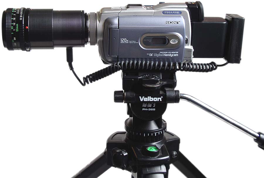 Kompletace. Matnicový díl se vloží do tubusu B tak, aby motorek byl nasměrován dolů a dal se zespodu zajistit červíkem (obr.22). To bude zaručovat - tj. pokud bude červená tečka nahoře - že motorek je dole a delší strana matnice tak zůstane vůči videokameře (nebo respektive horizontu) vodorovně. Nyní se protáhnou kontakty se zdířkou na Jack a zajistí matičkou (obr.23). Na díl B se dále nasune díl A, na který se pak nasadí objektiv Canon FD 50 mm. červená tečka dílu A bude v jedné linii s červenou tečkou na dílu B (obr.24). Správnou vzdálenost nasunutí lze zvolit například následovně: na objektivu se nastaví nekonečno, tubus se namíří na horizont v dáli (třeba z okna) se současným sledováním matnice (obr.25). Při identifikaci ostrého obrazu se dotáhne červík na dílu A podle obr.26. Zbývá našroubovat díl D na kameru podle obr.27: pro případ kompletace s videokamerou Sony od tvůrce adaptéru byla použita ještě i redukce 37/46 mm, protože Ø závitu na dílu D je 46 mm a kamera má onen menší průměr. Následuje nasunutí složeného tubusu na díl D červenými značkami nahoru dle obr.28; a to se správným natočením, jež lze už kontrolovat v hledáčku videokamery dle obr.29. Následuje jen dotáhnutí červíku na dílu B (obr.30) a rozbití šampaňského o takto dovybavený přístroj (:-D), respektive nějaký šetrnější druh oslavy díla. Před nasazením objektivu je nutné zajistit i chod mechaniky clony, což tvůrce řešil připájením zarážky z drátku, o níž se opírá kovový výčnělek objektivu Canon FD (obr.31). Zbývá nasadit objektiv - červenými tečkami do linie (obr.32) - zaostřit si matnici, udělat transfokátorem správný výřez, připojit konektorem Jack napájení, zapnout jej a zařadit se (zatím asi jen pomyslně) mezi elitu kameramanského světa. Názorný snímek sestavy v akci je na obr.33…