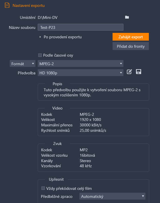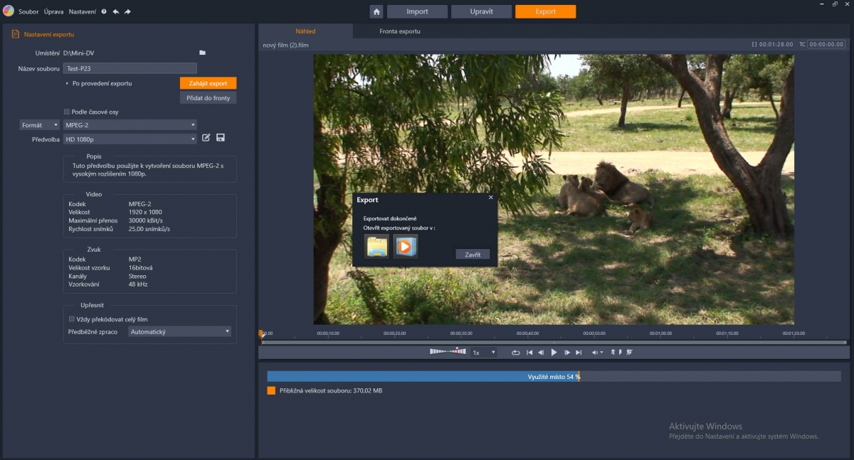 Každá rada bude komplikovaná o NEZNALOST konkrétních schopností čili funkcí Pinnacle VS15 (aspoň u mě). Právě jsem zkusil vystřihnout z hodinového HDV-videa 1,5 minutovou scénu se lvy (Afrika), pak nastavit pro export údaje neboli parametry vysoké kvality a zkusím přiložit snímky obrazovky Pinnacle VS23 do poslední věty. Funkčnost verze VS15 si opravdu asi 8 let nazpět bohužel nepamatuji. Z přiložených snímků vyplývá, že v současném P-VS23 lze nastavit jednoduše formát, rozlišení i datový tok. A při přehrávání se video jeví VELMI koukatelně... Smějící se Přikládám snímek celé obrazovky, screen nastavení exportu a dvoj-snímek DVOU detailů vlastností vyrenderovaného souboru. Jděme dále...